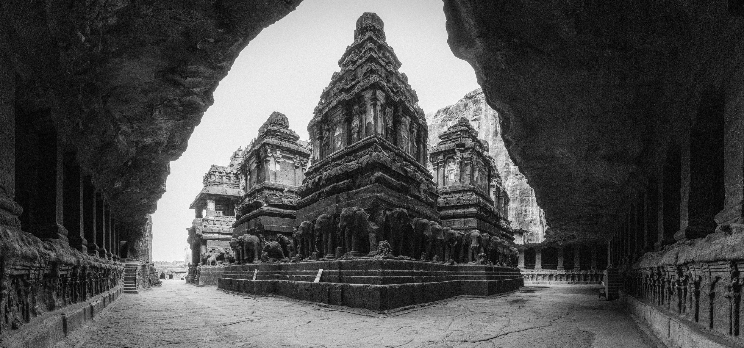 Look with me at just one of these sites: the Kailash Temple at the Ellora Caves. It was Michelangelo who best explained the concept of subtractive sculpture when he said, “I saw the angel in the marble and carved until I set him free.” Now consider these facts about the Kailash: Built 750 years before Michelangelo carved his statue of David, it remains the largest, monolithic, rock-cut monument in the world. Chiseled by hand out of a mountain-side of hard basalt, and from the top down, it required several generations to complete and the excavation of several hundred thousand tons of rock, with nothing added!